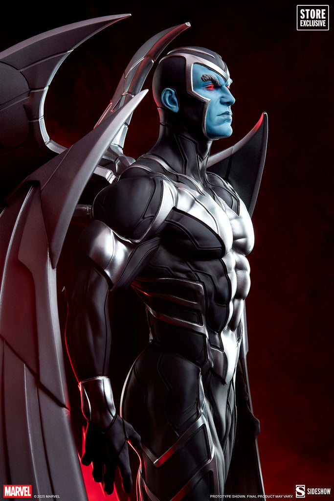 Savior, killer, harbinger of hope or destruction. The Archangel Premium Format Figure measures 28.5” tall, 16” wide, and 16” deep as Warren Worthington III hovers above a pile of infernal skulls. With his razor-sharp metal wings folded around his body like armor, Apocalypse’s lethal henchman surveys a battlefield rife with monsters and death. He is unstoppable as an instrument of evil — but his ascension came at the cost of his fall from grace.